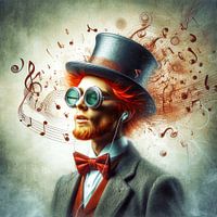 Portret van een man met rood haar, een bril en een hoed, die vol passie aan het zingen is in een microfoon, de noten vliegen door het beeld, wat een mooi, vrolijk en passievol beeld geeft dit. wat een plezier en kleurrijk geheel om naar te kijken.