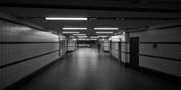 Man loopt met een aangelijnde hond in de metro van Hamburg in Duitsland.