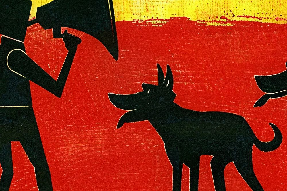 Dit unieke kunstwerk toont een intrigerende scène waarin een man en twee honden zijn afgebeeld in een silhouetstijl. De compositie is levendig met contrasterende kleuren van rood en geel op de achtergrond, wat het geheel een dynamische uitstraling geeft. De eenvoud van de silhouetten, gecombineerd met de gedurfde kleuren, maakt dit stuk ideaal voor moderne interieurs die een eclectisch tintje nodig hebben. Perfect voor kantoren, slaapkamers of als statement piece in een andere ruimte. Deze print voegt niet alleen visuele aantrekkingskracht toe, maar wekt ook nieuwsgierigheid en gesprekstof op. Een geweldige keuze voor liefhebbers van moderne en abstracte kunst.