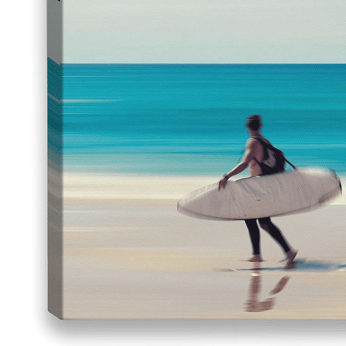 Abstracte foto van een man die met een surfplank over een strand loopt en verlangend naar golven kijkt.