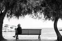 Relaxte, tevreden man op een bankje aan zee in Puglia, Italië
