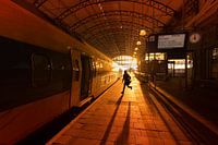 Koop de foto Man rent om een trein te halen op treinstation Den Haag Hollands Spoor van Rob Kints op canvas, aluminium dibond, (ingelijste) fotoprint, behang en ArtFrame, op maat geprint in Fine-Art kwaliteit.