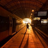 Treinreiziger rent naar gereedstaande trein op Station Hollands Spoor tegen de achtergrond van een ondergaande zon