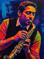 Dit opvallende schilderij toont een man in stille concentratie, waarbij de klarinet uit zijn handen rijst als een verlengstuk van zijn geest. Koele blauwtinten en rokerige grijstinten omringen hem en suggereren een jazzbar verloren in de tijd of de echo van een optreden in de schemering. Zijn uitdrukking is intens, meditatief, volledig verbonden met elke ademhaling en noot. Het penseelwerk bootst geluidsgolven en gesyncopeerd ritme na, wat energie en diepte geeft aan de compositie. Of het nu voor muziekliefhebbers is of voor mensen die de jazzcultuur bewonderen, dit kunstwerk maakt een statement - een statement van discipline, creativiteit en de taal van muziek zonder woorden.