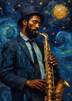 Dit schilderij toont een man ondergedompeld in de soulvolle tonen van zijn saxofoon, onder een wervelende hemel geïnspireerd door de Sterrennacht. Schilderachtige spiralen kabbelen naar buiten als noten die de nacht in worden gedragen, waarbij geluid en kosmos samensmelten tot één ononderbroken stroom. Zijn figuur leunt in het ritme, verlicht door getextureerde streken die zoemen van energie en sfeer. Het werk is meer dan een voorstelling, het is een viering van het vermogen van muziek om voorbij de aardse grenzen te stijgen en het doek te vullen met leven, geest en hemelse verwondering.