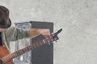 Man met hoed stemt zijn gitaar met versterker op de achtergrond