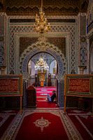 Een man zit op de grond bij de Al Quaraouiyine-moskee in de medina van Fez, wachtend op het avondgebed.