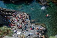Zomers plezier in en aan het water in Manarola, Cinque Terre, Italië.