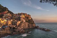 Manarola in de Cinque Terre area in Italie. Genomen op een mooie namiddag in het voorjaar met pastel kleuren in de lucht