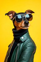 Een levendig karakter in een stijlvolle leren jas en een coole zonnebril straalt zelfvertrouwen uit. Met zijn alerte, intelligente ogen en karakteristieke spitse oren is de Manchester Terrier niet alleen charmant, maar ook modern en vol energie. Zijn felgele kleur benadrukt het vrolijke, onmiskenbare charisma van dit elegante hondenras.