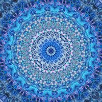 Een levendige mandala met ingewikkelde patronen die vanuit het midden naar buiten stralen. Koele blauwtinten en wat roze, magenta en paars vervlechten zich tot een complexe, symmetrische visuele ervaring die de aandacht trekt. Ik heb deze mandala digitaal gemaakt van een foto van het verenkleed van een van mijn kippen.