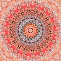 Een levendige mandala met ingewikkelde patronen die vanuit het midden naar buiten stralen. Warme rode en oranje tinten en koel blauw lopen in elkaar over om een complexe, symmetrische visuele ervaring te creëren die de aandacht trekt. Ik heb deze mandala digitaal gemaakt van een foto van het verenkleed van een van mijn kippen.