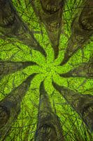 Sferische (dubbele) opname van een boom kroon in het bos.