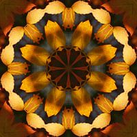 Mandala in aardse, donkere kleuren, voornamelijk geel en bruin, gemaakt van een echt beeld.
