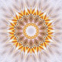 Mandala in zachte kleuren, overwegend geel en grijs, gemaakt op basis van een echt beeld.
