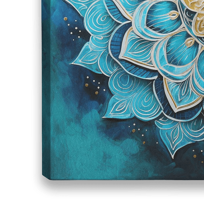 Abstracte mandala in blauw, turquoise en groen tinten met goud accent.