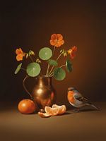 Mandarijn Mus 2 is een verstild schilderij uit de collectie Vogels en Bloemen, geïnspireerd op de 17e-eeuwse Hollandse schildertraditie, waarin eenvoud, licht en balans centraal staan. De compositie is minimalistisch en ruim opgezet, met veel negatieve ruimte en een zachte, subtiele lichtval die het geheel een rustige, bijna meditatieve…