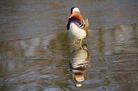 Een kleurige mandarijneend loopt over een dun laagje ijs in een vijver