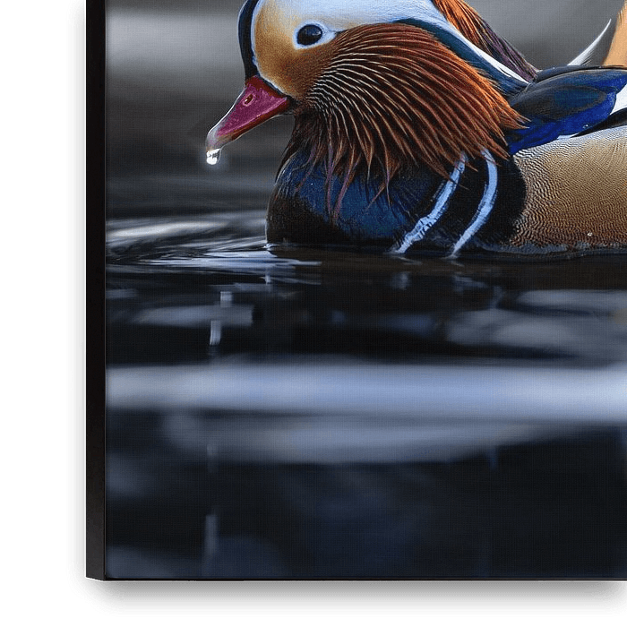 Kleurrijk beeld van een mandarijneend, gefotografeerd vlak boven het water. De kleurrijke eend is vanuit China in Nederland terechtgekomen als huisdier, als pronkdier. Inmiddels zijn ze uit gevangenschap in de Nederlandse natuur terecht gekomen.