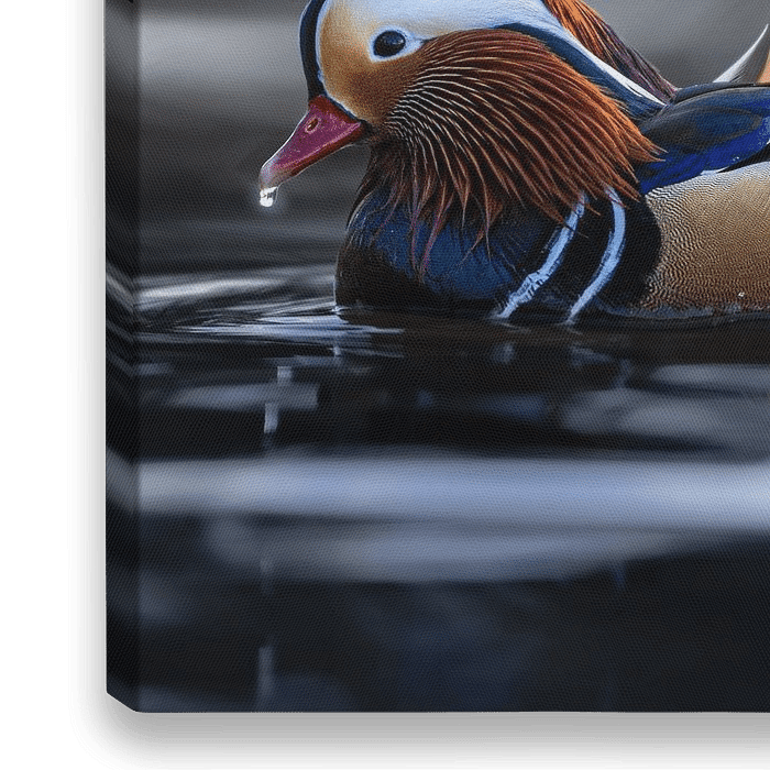 Kleurrijk beeld van een mandarijneend, gefotografeerd vlak boven het water. De kleurrijke eend is vanuit China in Nederland terechtgekomen als huisdier, als pronkdier. Inmiddels zijn ze uit gevangenschap in de Nederlandse natuur terecht gekomen.