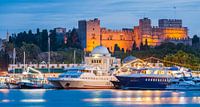 Mandraki Harbour en het Grand Master Palace in Rhodos City op het eiland Rhodos, Griekenland.