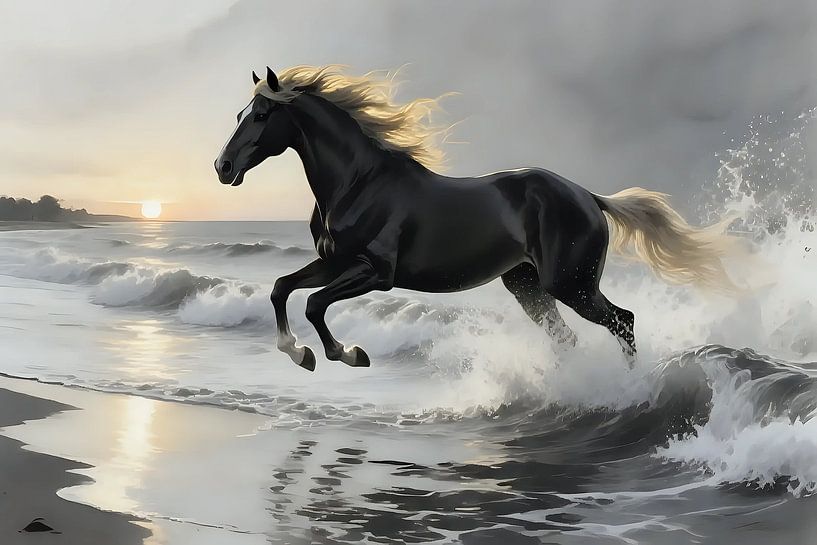 De foto toont een of twee paarden in volledige vrijheid, krachtig galopperend door het ondiepe water op het strand terwijl de zon in de horizon zakt. Het warme licht van de zonsondergang baadt het tafereel in tinten goud en oranje, die weerspiegeld worden in het glinsterende water en glinsterende reflecties creëren rond de hoeven van de…