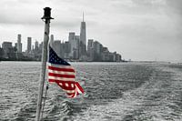 Manhattam in zwart/wit gefotografeerd vanaf de Hudson river met in de voorgrond de Amerikaanse vlag.