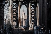 Klassiek uitzicht op de Manhattan Bridge, genomen vanaf Dumbo, een van de beroemdste fotoplekken in New York. De enorme stalen structuur steekt uit tussen de historische bakstenen gevels en combineert het verleden met moderniteit. Een symbool van de eindeloze energie van de stad en haar architectonische charme.