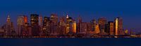 Downtown Manhattan vanaf de overkant van de Hudson River. Koude winteravond, ondergaande zon weerkaatst in glas van wolkenkrabbers rond Wall Street