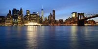 Manhattan Skyline en Brooklyn Bridge in New York in de avond, panorama. Het hoogste gebouw is One World Trade Center.