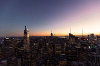 Een uitzicht op de skyline van Manhattan tijdens zonsondergang / blue hour genomen vanaf Top Of The Rock met uitzicht op One Vanderbilt en Empire State Building.