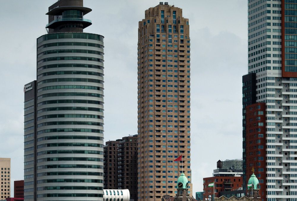 Op een bewolkte zomerdag komen de wolkenkrabbers op de Wilhelminakade goed uit. Een mooie combinatie tussen oud en nieuw met Hotel New York op de voorgrond en de Rotterdam op de achtergrond.