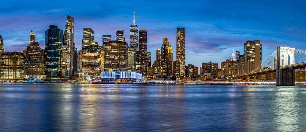 De spectaculaire skyline van het centrum van Manhattan rijst op in de achtergrond en schittert in al zijn nachtelijke pracht. De torenhoge wolkenkrabbers, waaronder het opvallende One World Trade Centre, steken duidelijk af tegen de diepe, donkere lucht en worden glinsterend weerspiegeld in de rivier. De stadslichten schitteren als fonkelende sterren en geven de foto een levendige maar rustgevende sfeer.