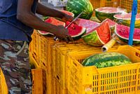 Mann schneidet Melone auf dem Wochenmarkt in Italien