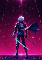 Mannelijke anime krijger kijkt omhoog naar de hemel in neontint en vallende bloemblaadjes