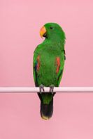 Koop de foto Mannelijke groene edelpapegaai in het roze van Elles Rijsdijk op canvas, aluminium dibond, (ingelijste) fotoprint, behang en ArtFrame, op maat geprint in Fine-Art kwaliteit.