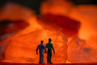 2 Mannelijke miniaturen die hand in hand kijken naar brandende oranje stenen. Prachtige kleine mannelijke homoseksuele miniaturen die ook nog eens mooi gekleurd zijn en waarmee je mooie creatieve foto's kan maken.