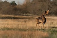 Mannetjes damhert tijdens de bronsttijd in de Amsterdamse waterleiding duinen in Nederland. Hert met een imposant gewei staat op een grasvlakte te kijken met bos op de achtergrond.