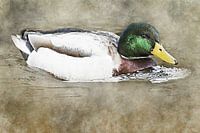 Digitaal mixed media kunstwerk van een mannetjes eend welke rustig in het water aan het dobberen is.