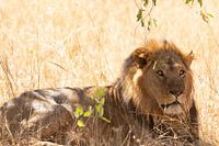 Mannetjes leeuw tijdens safari in het Chobe National Park van Botswana. De leeuw kijkt recht in de camera en zijn blik zegt eigenlijk wel genoeg, kom niet heel veel dichterbij.