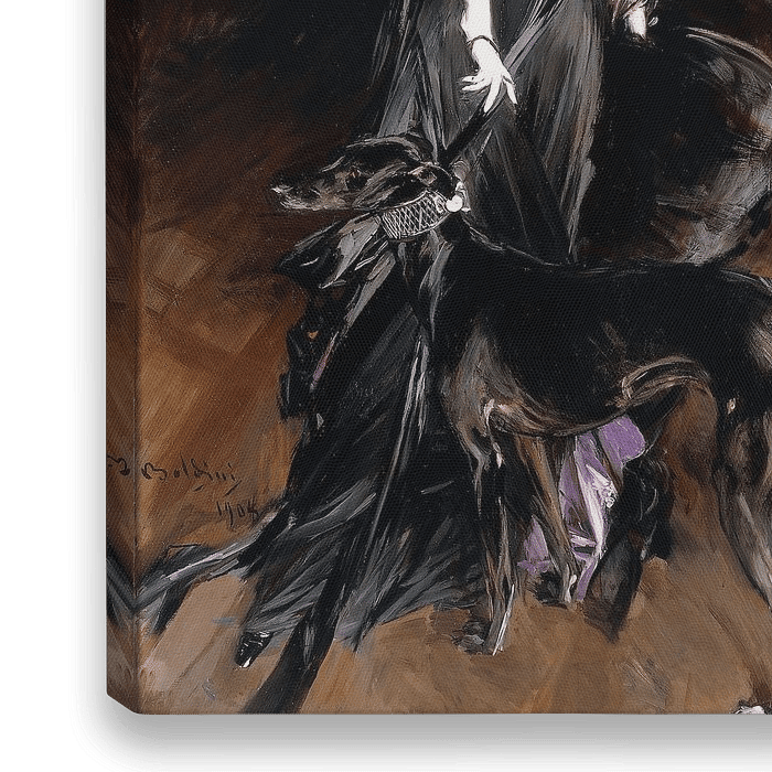 Koop Marchesa Luisa Casati with a Greyhound, Giovanni Boldini als reproductie op canvas, aluminium dibond, (ingelijste) fotoprint, behang en ArtFrame, op maat geprint in Fine-Art kwaliteit.