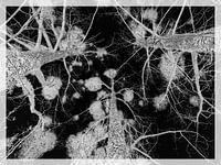 Negatief van bomen overvloedig begroeid met Maretak. De foto is genomen met de camera liggend op de grond tussen de 3 bomen om perspectief te versterken. Het omdraaien van zwart en wit zorgt voor een "spooky" effect.