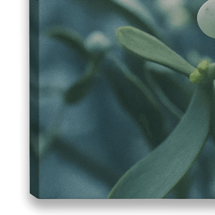 Een filmisch winterbeeld van de maretak in koel, analoog licht. De subtiele korrel, zachte onscherpte en lichte glans van de bessen creëren een magische, tijdloze sfeer die perfect past bij de mythische betekenis van deze plant.