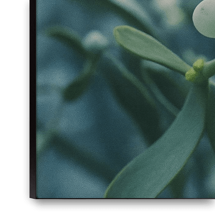 Een filmisch winterbeeld van de maretak in koel, analoog licht. De subtiele korrel, zachte onscherpte en lichte glans van de bessen creëren een magische, tijdloze sfeer die perfect past bij de mythische betekenis van deze plant.
