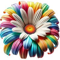 Deze poster toont een prachtige, artistieke afbeelding van een madeliefje, waarvan de bloemblaadjes oplichten in een spectaculaire regenboog van kleuren. De afbeelding vangt de essentie van de bloem, met haar heldergele centrum en klassieke witte bloemblaadjes die evolueren in een levendige weergave van kleur. De creatieve interpretatie…