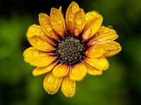 Een close up van een Margriet en haar kroonbladeren na een regenbui.