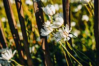 Margrieten aan houten hek – botanische muurkunst in warm avondlicht van Broodrooster Studio – Creatieve Fotografie