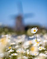 Een margriet die boven andere margrieten uitsteekt. Op de achtergrond zie je de Molen het Noorden op Texel.