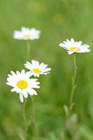 Margrieten (Leucanthemum vulgare) in een weide tijdens een mooie lentedag. Close up foto met een beperkte scherpte diepte waardoor de Margriet bloemen in de achtergrond vaag worden.