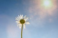 Een enkele margriet van onderen, met een blauwe hemel en felle zon